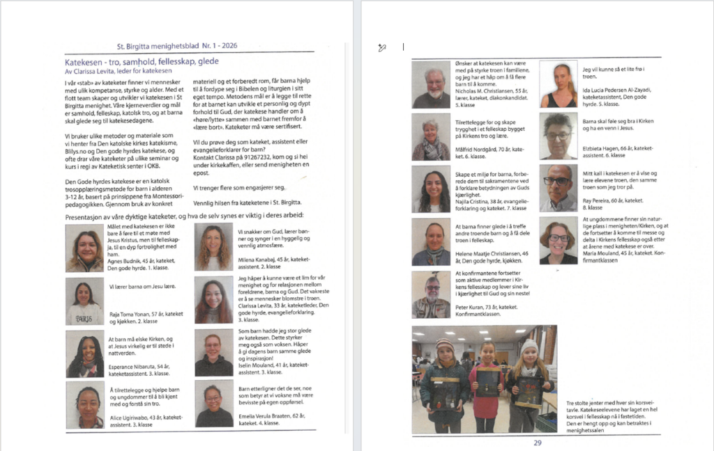 I denne artikkelen fra St. Birgittas menighetsblad (Fredrikstad) får vi et lite innblikk katekesen i menigheten. Her har vi en gjeng dedikerte og engasjerte kateketer. Det er en fin kilde til inspirasjon for alle oss andre som driver med barne- og ungdomsarbeid i våre lokale menigheter.